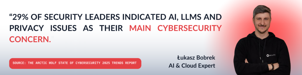 The increasing complexity of such systems significantly expands the potential attack surface. More companies are concerned about AI threats. According to The Arctic Wolf State of Cybersecurity 2025 Trends Report, 29% of security leaders indicated AI, LLMs, and privacy issues as their main cybersecurity concern, making it their top area of focus.