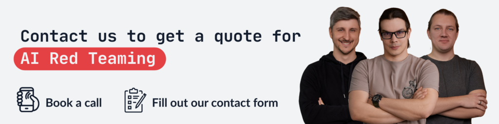 Book a call or fill out our contact form to get a quote for AI Red Teaming. Every organization is different – we’ll get in touch with you to determine the specifics of your needs and the broader context of security testing.