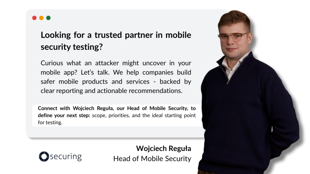 If you wish to get a quote for mobile application security testing, feel free to book a call with our specialist or write to us. Each application is different. You will receive a set of questions that will help us estimate workload and needed skills, based on which we will prepare an offer.